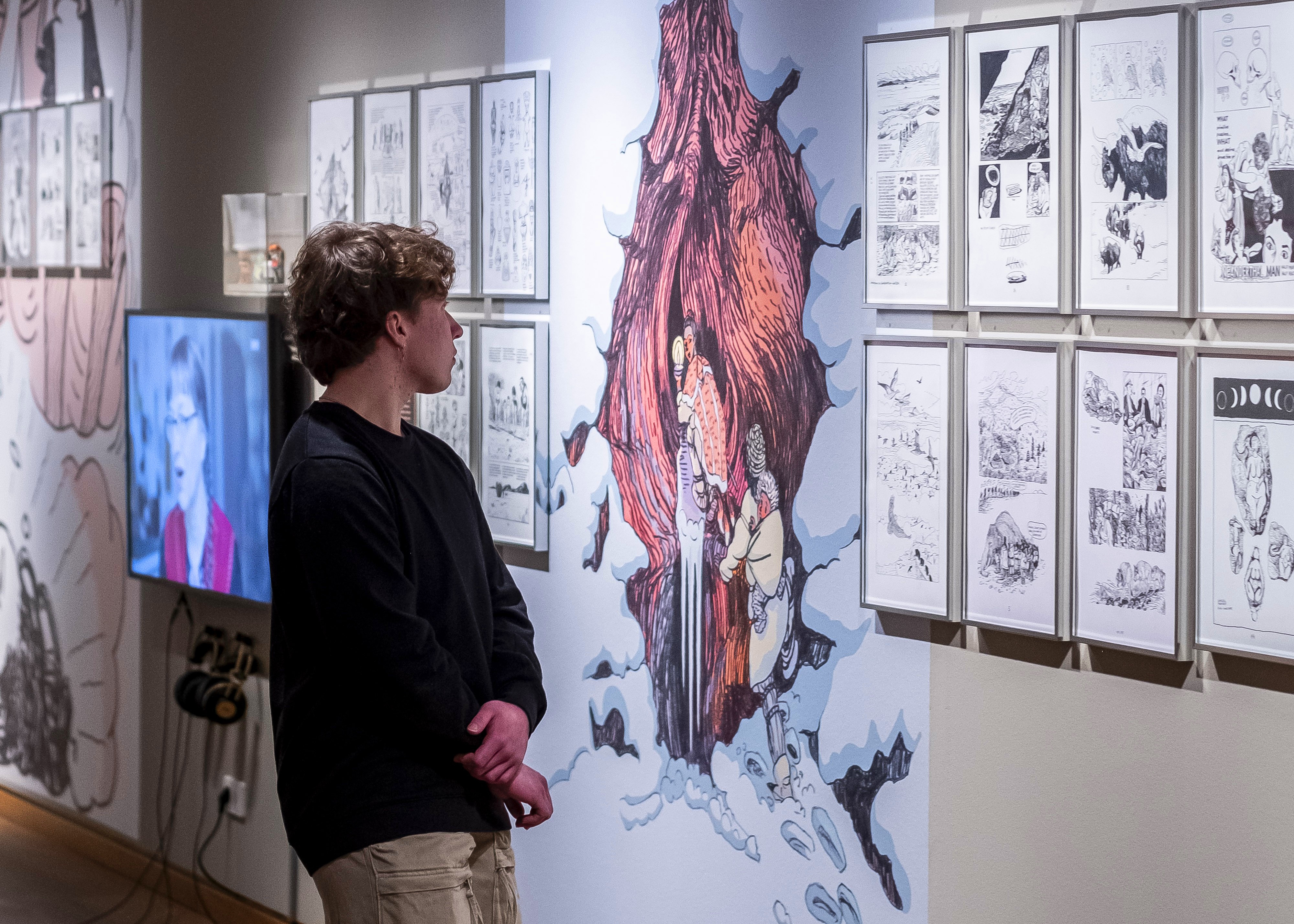 Gezeigt werden Arbeiten aus den autobiografischen Graphic Novels Heute ist der letzte Tag vom Rest deines Lebens (2009) und Wie ich versuchte ein guter Mensch zu sein (2017), die international gefeiert und vielfach ausgezeichnet wurden. Ergänzt wird die Ausstellung durch die jüngste Comicreportage Die Frau als Mensch. Am Anfang der Geschichte (2025), für die Ulli Lust mit dem Deutschen Sachbuchpreis ausgezeichnet wurde. Mit kunst- und sozialgeschichtlicher Präzision hinterfragt sie darin hartnäckige Mythen über frühe Geschlechterrollen und patriarchale Erzählungen. Weitere Werkzyklen, darunter Porträts, Reportagen und freie Zeichnungen, erweitern den Blick auf Lusts vielseitiges Schaffen. Mit dem in Kürze erscheinenden zweiten Teil Die Frau als Mensch. Schamaninnen (2026) ist auch ihre jüngste Arbeit in der Ausstellung vertreten.